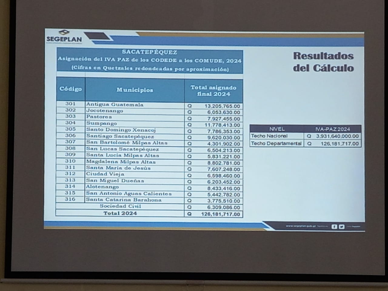 En cumplimiento a la Ley de Consejos de Desarrollo, el Director Ejecutivo de Codede y el Gobernador Departamental de Sacatepéquez en coordinación con Segeplan e integrantes del pleno de Consejos de Desarrollo, llevaron a cabo reunión extraordinaria de Codede. Como punto medular se hablo: "Presentación y aprobación de la Distribución de los recursos a los COMUDES para el Ejercicio Fiscal 2024 del Departamento de Sacatepéquez".